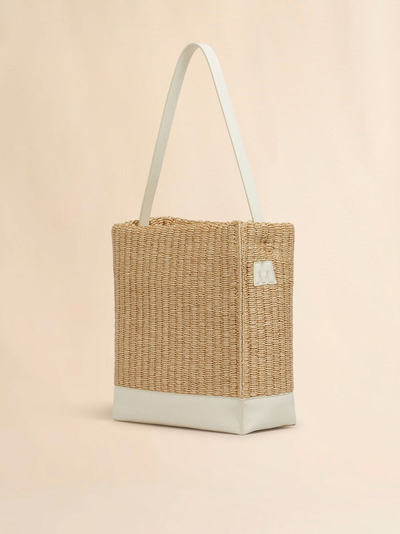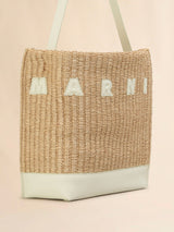 Museo hobo bag crafted from woven raffia-effect fabric. Small size. Contrast leather base. Embellished with puffy leather Marni patches. Open design with single top handle. Lined interior with zip pocket and embroidered logo patch. Made in Italy